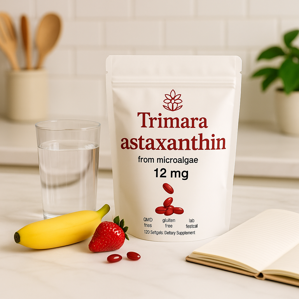 Each capsule of Astaxanthin by Trimara™ delivers a clinically dosed, high-bioavailability extract — designed to help you glow stronger, think clearer, and age slower.